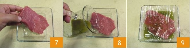 Nettoyez le filet de bœuf en éliminant les parties de graisse ou de tissu conjonctif, puis transférez-le dans un récipient 7 et versez l'émulsion d'huile et d'herbes aromatiques à l'intérieur 8. Couvrez avec un film plastique et laissez mariner à température ambiante pendant environ 15 minutes 9. Vous pouvez retourner la viande après 6-7 minutes afin de bien tremper l'autre côté de la viande dans la marinade.