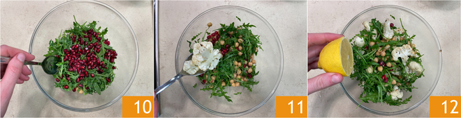 Mélangez 10 et ajoutez le chou-fleur froid 11, puis pressez le jus de citron sur la salade 12