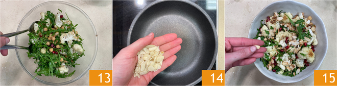 Ajoutez les autres 20 grammes d'huile et mélangez 13. Faites griller brièvement les amandes effilées dans une poêle chaude, en veillant à remuer constamment pour ne pas brûler 14. Garnissez en surface et voici votre salade de chou-fleur rôti prête 15.