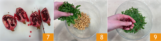 En attendant, égrenez la grenade et obtenez 100 g de graines 7. Rincez les pois chiches et mettez-les dans un grand bol avec la roquette, également rincée et séchée 8. Ajoutez les graines de grenade 9.