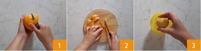 Pour préparer la salade de kakis, roquette et fenouil, commencez par couper le zeste d'une demi-orange en prenant soin de ne pas prendre la partie blanche 1. Coupez le zeste en fines lamelles 2 et réservez jusqu'au moment de les utiliser. Pressez une demi-orange et un demi-citron 3,