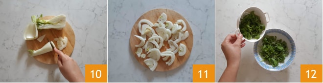 Prenez un fenouil également lavé et coupez-le en tranches 10 11. Dans un saladier, mettez la roquette déjà lavée 12,