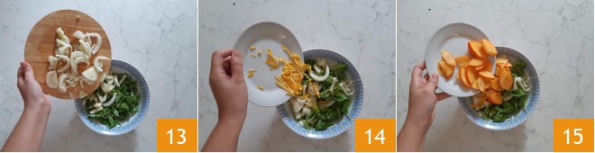 ajoutez le fenouil 13, le zeste d'orange coupé en lamelles 14 et le kaki-pomme en tranches 15.
