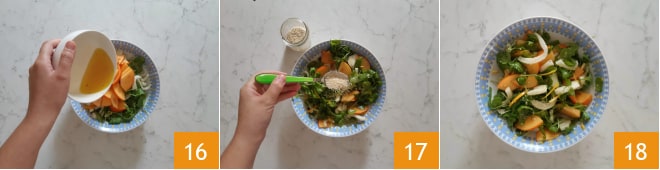 Versez par-dessus la vinaigrette d'orange et de citron 16, mélangez le tout et ajoutez une cuillère à soupe de graines de sésame 17. Servez immédiatement la salade de kakis, roquette et fenouil 18.