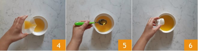 recueillez le jus dans un bol 4. Ajoutez une cuillère à soupe de miel 5, une pincée de sel 6 et un tour de moulin à poivre noir.