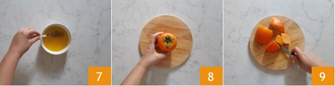 Avec une fourchette, battez le tout pour bien amalgamer les ingrédients entre eux 7. Prenez un kaki-pomme déjà lavé et séché 8, coupez-le en fines tranches 9.