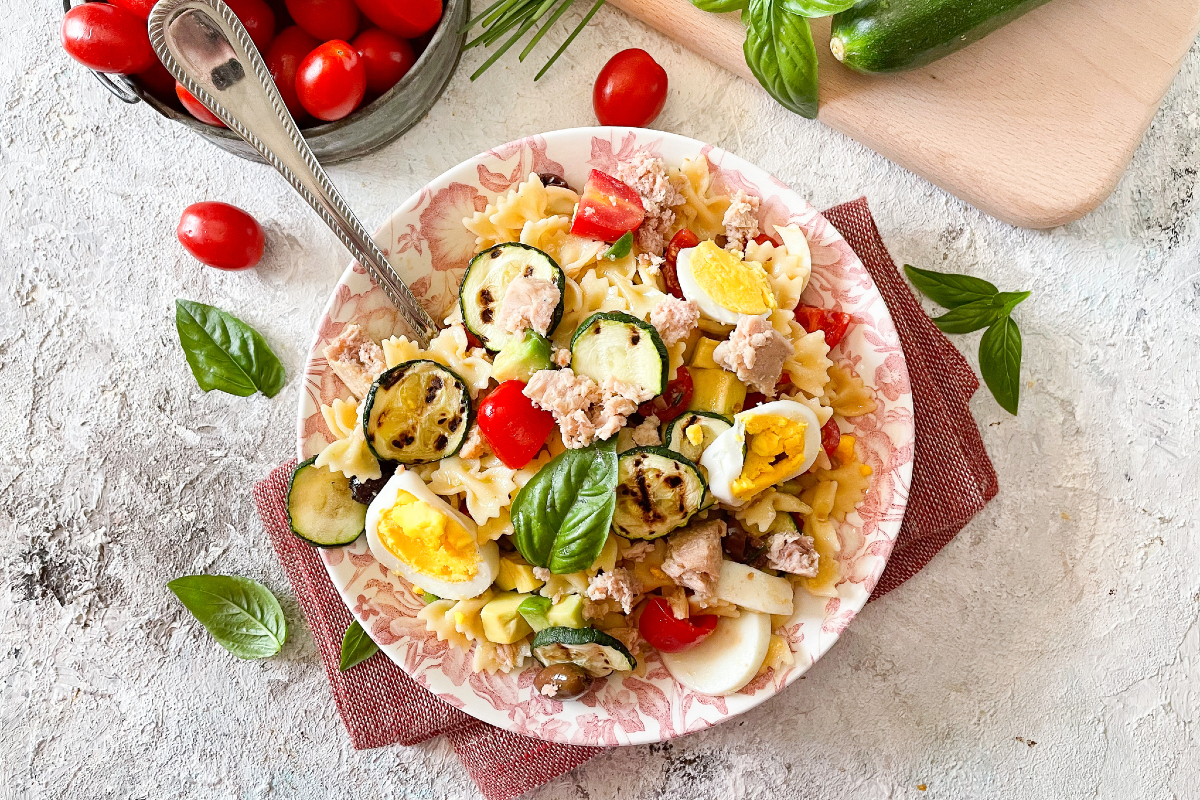 Les Pâtes froides sont l'un des plats d'été que nous aimons le plus. Il y a tellement de variantes de pâtes froides, toutes délicieuses et originales, aujourd'hui nous vous présentons une version simple mais savoureuse : les pâtes froides au thon. Un plat facile à préparer, à personnaliser avec les ingrédients que vous avez à la maison et pratique à emporter en pique-nique ou au travail. Pour réaliser ces pâtes, en plus du thon, nous avons ajouté des courgettes grillées, des cubes tendres d'avocat, des tomates cerises, des olives, des œufs durs et de nombreuses herbes aromatiques qui donneront un délicieux parfum. Bien sûr, vous pouvez varier tous ces ingrédients en fonction de vos goûts, créant ainsi un plat toujours différent à partager avec toute la famille !