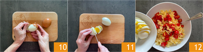 Reprenez maintenant les œufs et écalez-les 10. Coupez-les en tranches 11, ou si vous préférez, en quartiers. Lorsque les pâtes sont froides, ajoutez les morceaux de tomates cerises et les œufs durs 11.