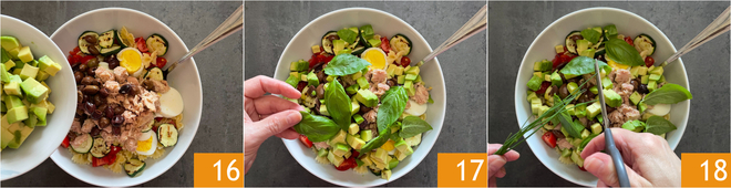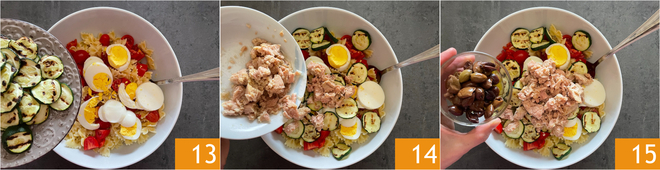 Ajoutez également les courgettes grillées 13, le thon bien égoutté 14 et les olives 15.