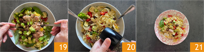 Mélangez bien 19, ajustez le sel et le poivre 20. Ajoutez un bon filet d'huile et mélangez à nouveau. Placez les pâtes froides au thon au réfrigérateur jusqu'au moment de servir 21.