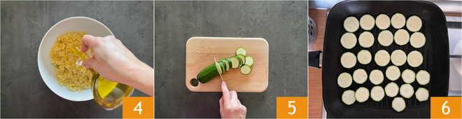 Assaisonnez-les avec un filet d'huile 4, mélangez et laissez-les refroidir. Après 7 minutes, égouttez également les œufs et refroidissez-les sous l'eau courante. Passez aux courgettes : lavez-les bien et coupez-les en rondelles 5. Faites chauffer un gril et placez les tranches de courgettes dessus 6.