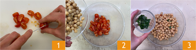 Pour préparer la salade de pois chiches et thon, commencez par laver les tomates cerises, coupez-les en quartiers 1 et transférez-les dans un bol. Ajoutez les pois chiches précuits 2, préalablement rincés et bien égouttés, et le basilic en morceaux 3.