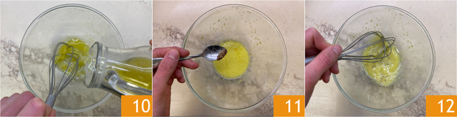 Versez l'huile en filet tout en mélangeant avec un fouet 10, vous pouvez aussi utiliser un mixeur plongeant. Lorsque la vinaigrette est émulsionnée, ajoutez la moutarde 11 et mélangez à nouveau 12.