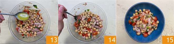 Assaisonnez la salade 13, mélangez 14 et servez. Votre salade de pois chiches et thon est prête à être servie 15.