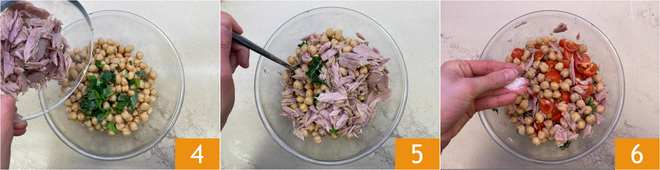 Émiettez le thon, avec les mains ou avec une fourchette, et ajoutez-le dans le bol 4. Mélangez 5 et ajustez le sel 6.