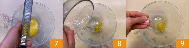 Maintenant, préparez la vinaigrette à la moutarde. Dans un bol, râpez le zeste d'un citron 7, ajoutez aussi son jus 8 et le sel 9.
