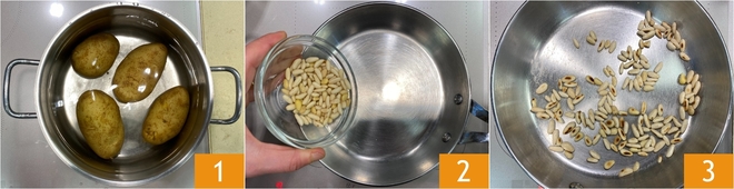 Pour réaliser la salade de pommes de terre à la chicorée et à la feta, commencez par cuire les pommes de terre dans de l'eau froide pendant environ 30-40 minutes, jusqu'à ce qu'elles soient assez tendres pour être piquées avec une fourchette 1. Pendant ce temps, versez les pignons dans une poêle 2 et faites-les toaster pendant environ 2 minutes 3, puis réservez-les.