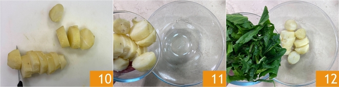 Lorsque les pommes de terre seront refroidies, retirez la peau et coupez-les en cubes d'environ 3-4 cm 10. Transférez les cubes de pommes de terre dans un grand saladier 11, puis ajoutez la chicorée que vous aurez égouttée et essuyée 12.