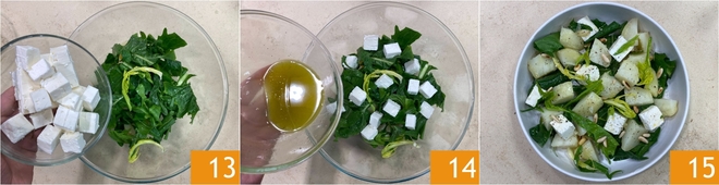 Ajoutez également la feta 13 et les pignons toastés. Enfin, assaisonnez avec la vinaigrette 14. Mélangez délicatement et servez votre salade de pommes de terre à la chicorée et à la feta 15 !