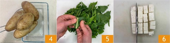 Une fois cuites, égouttez les pommes de terre et laissez-les refroidir 4. Entre-temps, nettoyez la chicorée en retirant les tiges les plus dures 5 et coupez grossièrement les feuilles, puis rincez-les sous l'eau courante. Coupez la feta en dés 6.