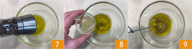 Versez l'huile dans un petit bol, puis ajoutez le sel, le poivre 7 et le vinaigre de cidre 8. Émulsionnez bien et réservez 9.