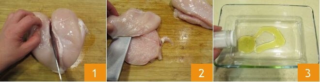 Pour préparer la salade de poulet et pommes, commencez par diviser en deux le blanc de poulet 1, enlevez les parties grasses, puis coupez-le en tranches épaisses de 1 cm 2. Prenez un plat à four, versez un filet d'huile d'olive au fond et assaisonnez de poivre et de sel 3.