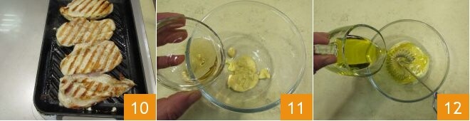 Faites cuire le poulet pendant environ 4-5 minutes de chaque côté (ou jusqu'à ce qu'il soit bien cuit et qu'il présente les stries typiques de la grille) 10. Une fois prêt, mettez le poulet de côté et occupez-vous de la sauce pour assaisonner la salade de poulet et pommes : dans un bol, versez la moutarde, ajoutez le vinaigre de cidre 11 et ensuite l'huile d'olive 12,