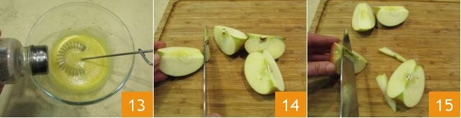 enfin salez, poivrez et mélangez pour bien émulsionner la sauce 13. Lavez et séchez les pommes, divisez-les en quartiers 14, retirez le trognon 15