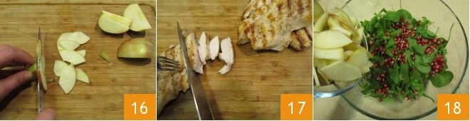 puis tranchez-les finement sans retirer la peau 16. Prenez les tranches de poulet grillé et coupez-les en diagonale en lanières d'environ 1 cm d'épaisseur 17. Tout est prêt pour composer la salade : dans un bol, versez la roquette et les jeunes pousses d'épinards, les tranches de pomme 18