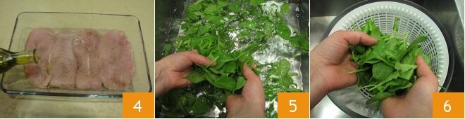 Disposez ici les tranches de poulet que vous avez coupées, puis assaisonnez-les également en surface avec l'huile 4, du sel et du poivre. Laissez-les imprégner et pendant ce temps, occupez-vous de la salade : lavez la roquette et les jeunes pousses d'épinards 5, puis séchez-les avec une essoreuse à salade 6 et mettez-les de côté.