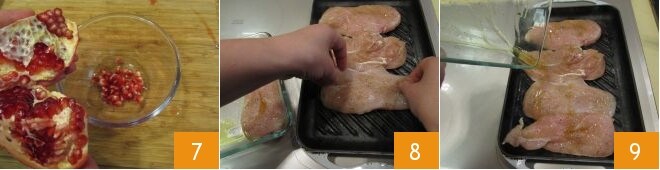Égrainez la grenade et recueillez les graines dans un bol : vous devrez obtenir environ 150 g de grains de grenade 7. Prenez soin maintenant de la cuisson du poulet : chauffez bien une plaque et, lorsqu'elle sera bien chaude, déposez les tranches de poulet 8 en veillant à les arroser avec l'assaisonnement utilisé pour la courte marinade 9.