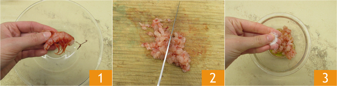 Pour préparer la salade avec agrumes, jeunes pousses d'épinards et crevettes, commencez par nettoyer les crevettes : détachez la tête, la carapace 1 et retirez l'intestin. Sur une planche, hachez-les en petits morceaux pour réaliser un tartare 2. Versez le tartare de crevettes dans un bol et assaisonnez avec 50 g d'huile et une pincée de sel 3.