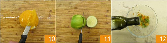 Faites de même pour l'orange 10 et le citron vert 11. Versez dans le bol des zestes 50 g d'huile d'olive extra vierge 12.