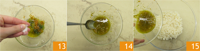 Assaisonnez avec une pincée de sel 13 et un peu de poivre rose, mélangez bien 14 et assaisonnez le riz 15.