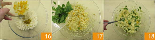 Ajoutez également la pulpe des agrumes 16 et les jeunes pousses d'épinards que vous aurez préalablement déchirées grossièrement à la main 17. Mélangez pour amalgamer 18.