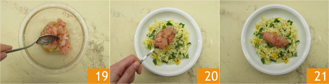 Mélangez 19 et dressez le riz dans une assiette, en déposant dessus une quenelle de crevettes 20 et enfin décorez avec les arachides grillées et hachées 21.