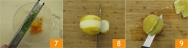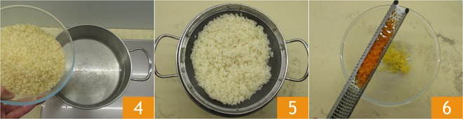 En attendant, occupez-vous du riz, faites-le bouillir 4 pendant le temps indiqué sur l'emballage dans de l'eau bouillante et salée. Une fois prêt, égouttez-le 5 et mettez-le de côté. Râpez le zeste du citron et de l'orange 6.