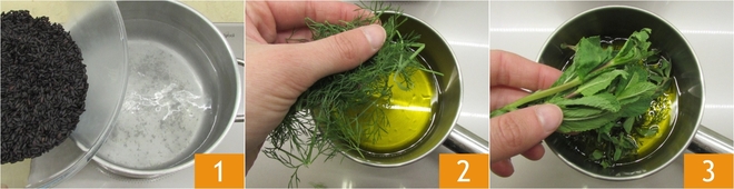 Pour réaliser la salade de riz avec herbes aromatiques et œuf mollet, commencez par porter à ébullition une casserole d'eau salée, puis versez le riz noir complet 1 et faites cuire pendant le temps indiqué sur l'emballage. Pendant ce temps, préparez l'huile aux herbes : versez l'huile dans une petite casserole et ajoutez le fenouil 2, le persil et la marjolaine 3.