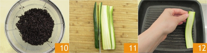 Quand le riz est cuit, égouttez-le et laissez-le tiédir 10. Passez aux courgettes : équeutez-les et tranchez-les dans le sens de la longueur à une épaisseur d'environ 3 mm 11, puis placez-les sur un gril bien chaud 12.