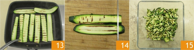 Grillez les courgettes des deux côtés 13, puis coupez-les en lanières sur le côté court 14. Salez et réservez 15.