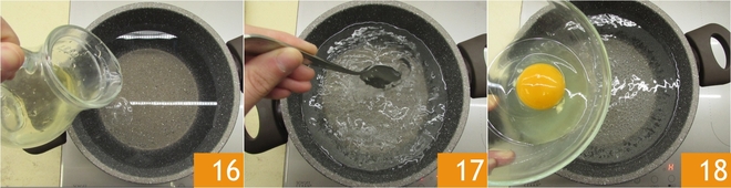 Enfin, préparez l'œuf mollet : remplissez une casserole profonde d'eau, ajoutez le vinaigre 16 et portez à léger frémissement. Quand l'eau frémit, baissez le feu et créez un tourbillon au centre avec une cuillère ou un fouet 17, puis faites glisser délicatement un œuf que vous aurez cassé dans un petit bol à part 18.