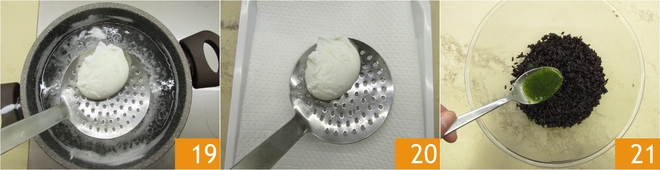 Laissez cuire l'œuf pendant 3 minutes sans le toucher, puis égouttez-le avec une écumoire 19 et transférez-le sur un plateau recouvert de papier absorbant 20. Procédez de la même façon avec les autres œufs. À ce stade, vous êtes prêt à dresser : assaisonnez le riz avec l'huile aux herbes 21 et mélangez bien.