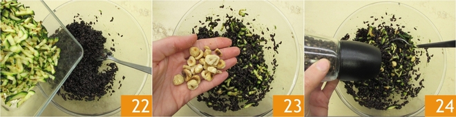 Ajoutez les courgettes 22 et les noisettes grillées 23, puis mélangez et ajustez le sel et le poivre 24.