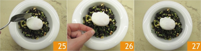 Répartissez le riz ainsi assaisonné dans les assiettes et posez sur chacune un œuf poché, en faisant très attention à ne pas le casser 25. Garnissez avec quelques brins de fenouil 26 et servez votre salade de riz avec herbes aromatiques et œuf mollet 27 !