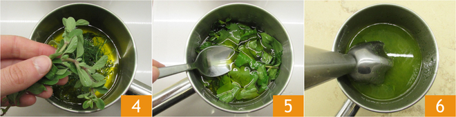 Ajoutez également la menthe 4 et chauffez l'huile à feu très doux pendant 10 minutes 5, puis mixez avec un mixeur plongeant 6. Transférez l'huile aromatisée au réfrigérateur jusqu'au moment de l'utiliser.