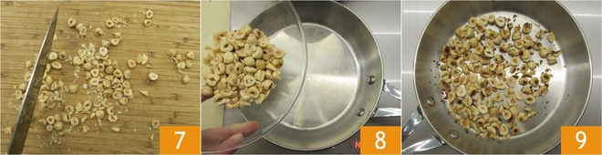 Entre-temps, hachez grossièrement les noisettes 7 et faites-les griller dans une poêle à feu moyen pendant quelques minutes 8, puis réservez 9.