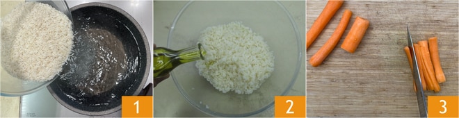 Pour réaliser la salade de riz avec des légumes et des cacahuètes, faites d'abord cuire le riz dans de l'eau bouillante salée pendant environ 10 minutes 1. Une fois ce temps écoulé, égouttez le riz et refroidissez-le sous l'eau courante, puis transférez-le dans un bol, assaisonnez d'un filet d'huile 2 et laissez refroidir. Pendant ce temps, préparez les légumes : épluchez les carottes et coupez-les en julienne 3.