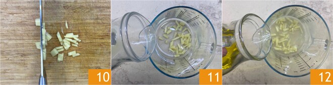 Enfin, épluchez le gingembre et réduisez-le en morceaux 10. Mettez le gingembre dans un pichet, puis versez le jus de lime 11 et l'huile 12.