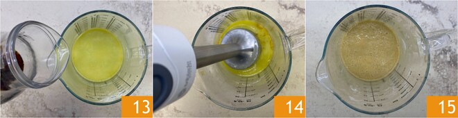 Mixez avec un mixeur plongeant, puis ajoutez la sauce soja 13 et mixez encore 14 jusqu'à obtenir une sauce lisse et homogène 15.
