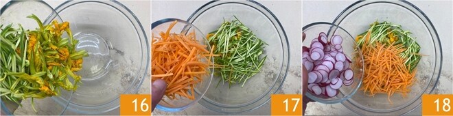 À ce point, transférez tous les légumes dans un grand bol : les courgettes avec leurs fleurs 16, les carottes 17 et les radis 18.